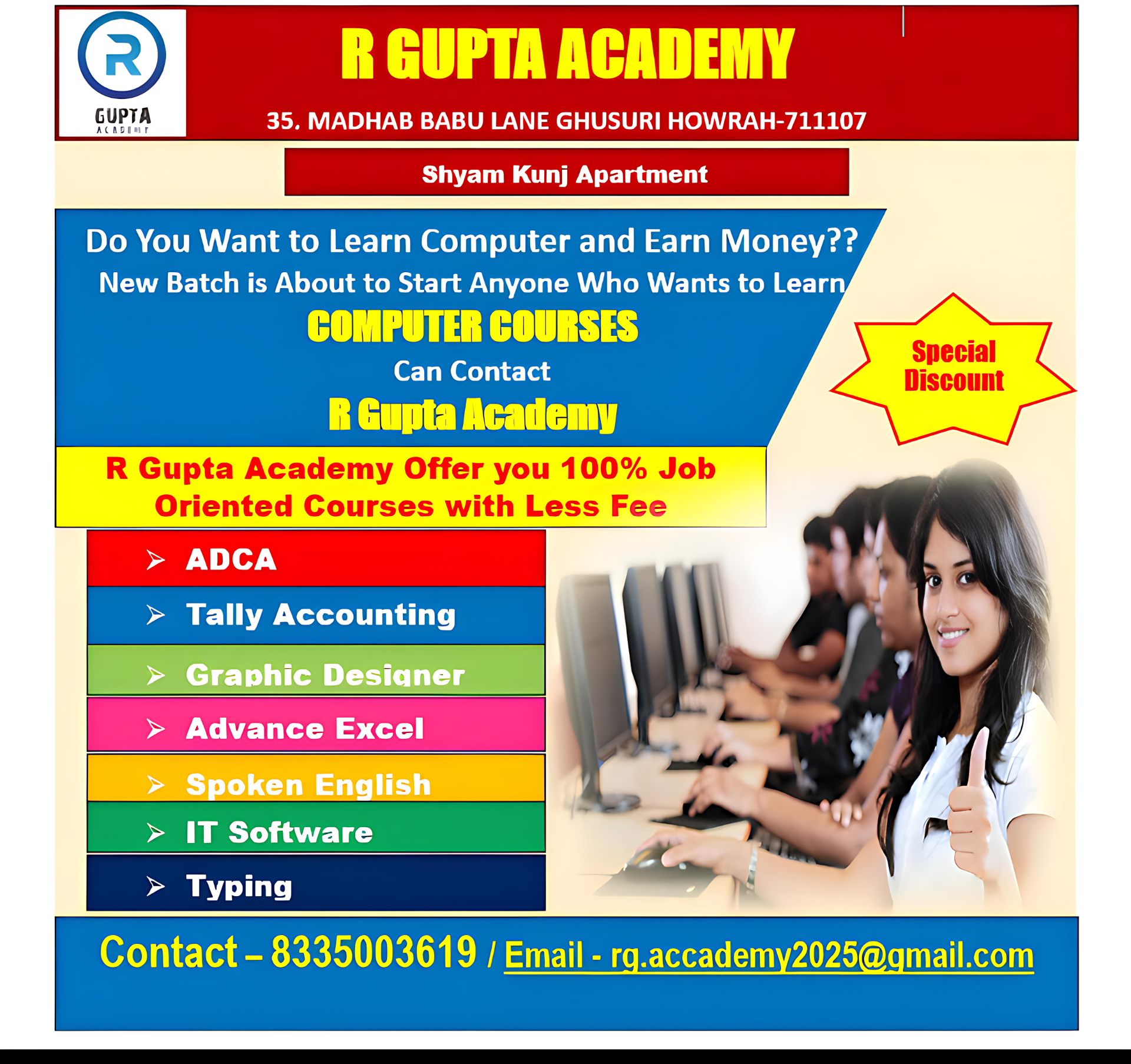 R GUPTA ACADEMY, is the biggest Educational Institute which provides a great platform in IT sectors in 35, Madhab Babu Lane, Ghusuri, Howrah. It is An Authorized Training Center of Dream India Foundation having mission to promote IT, Vocational & Skill education awareness to provide strong plinth to construct their bright fruture ans career. It is an independent to cater to the basic needs in IT, Vocational & Skill education.